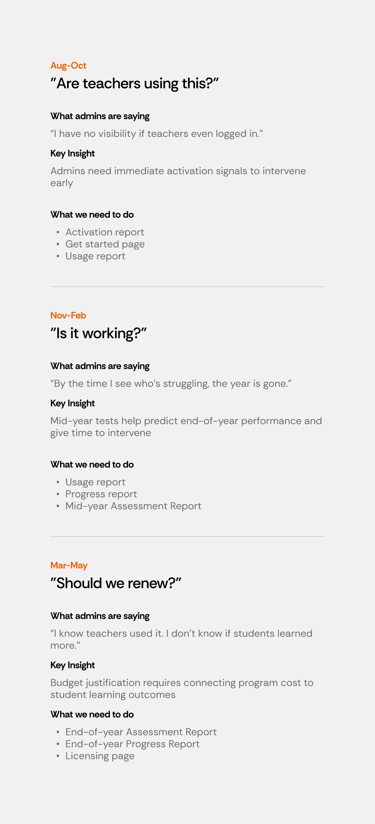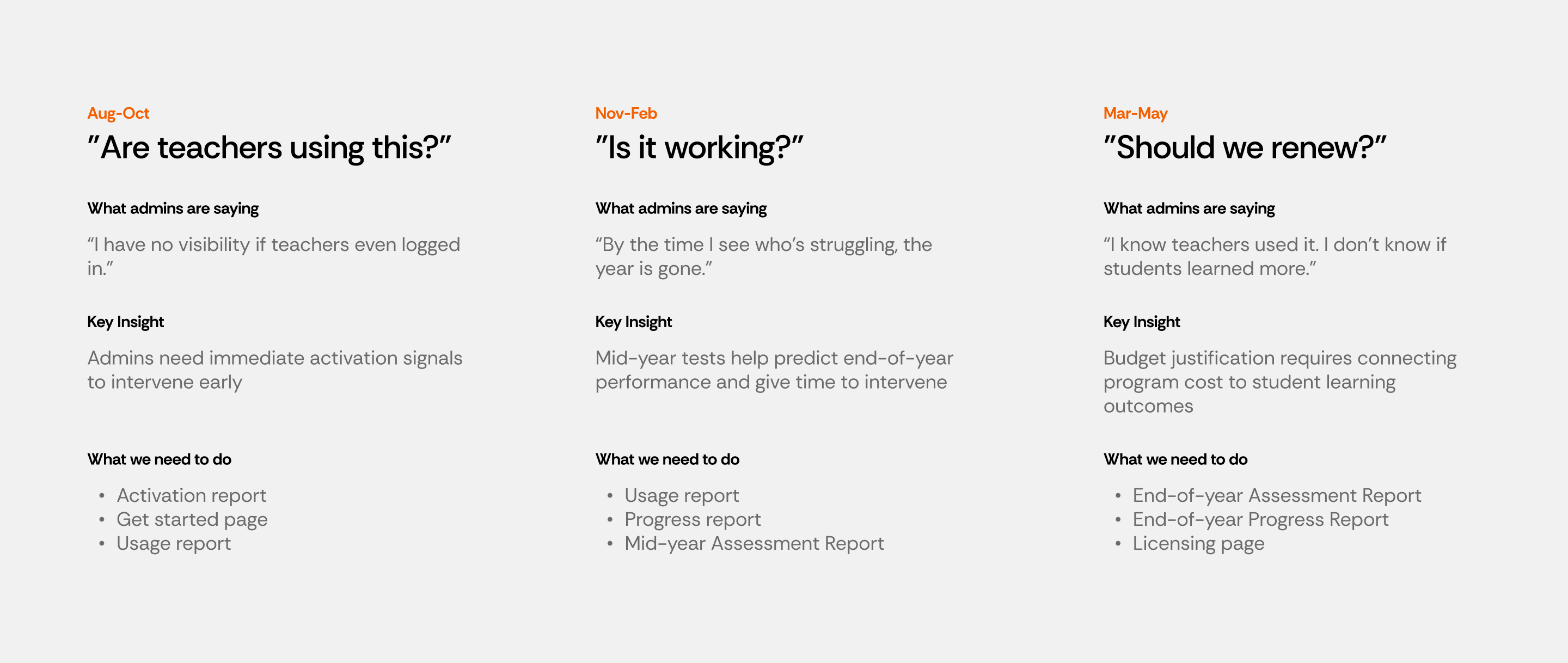 This reframed everything. We weren't just aggregating data wrong—we were treating admins as teachers, but their needs are different.
